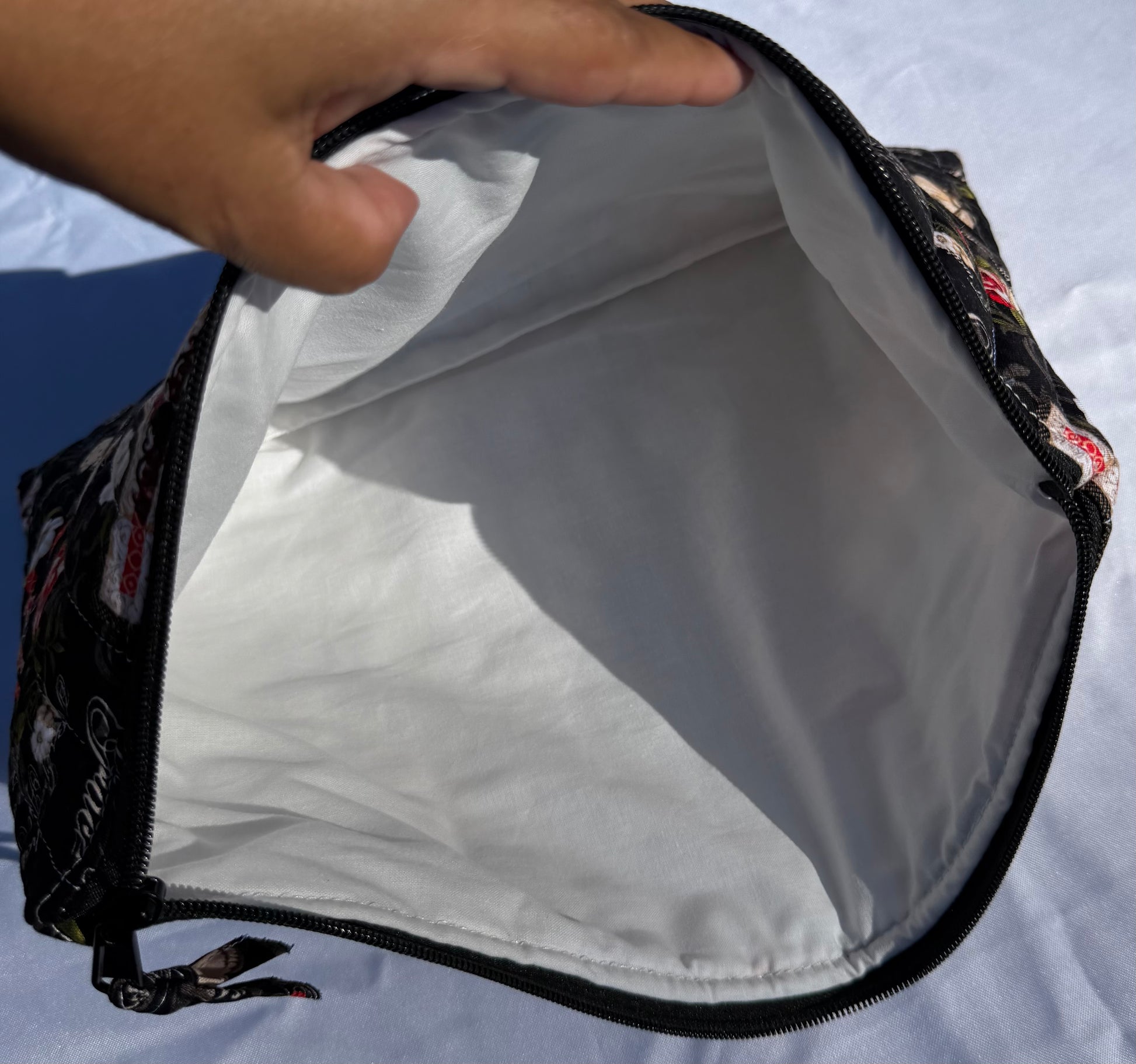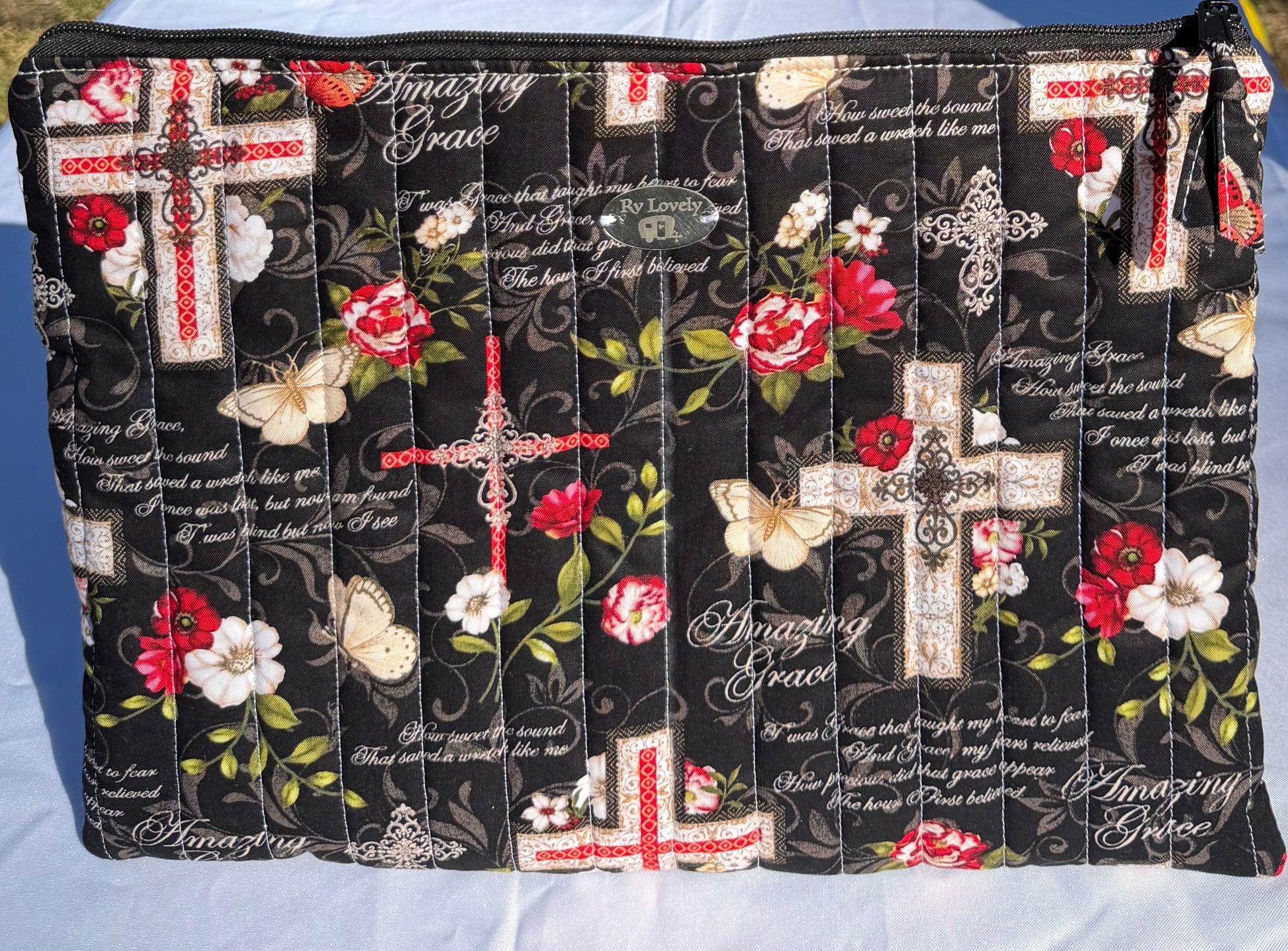Protect your device in style with this handmade quilted laptop sleeve featuring an inspirational Amazing Grace theme. The exterior is created from high quality black fabric adorned with detailed cross motifs, elegant script text from the hymn, vibrant red and white roses, soft green leaves, and delicate butterflies. Vertical quilt stitching adds structure, durability, and a clean, tailored look.