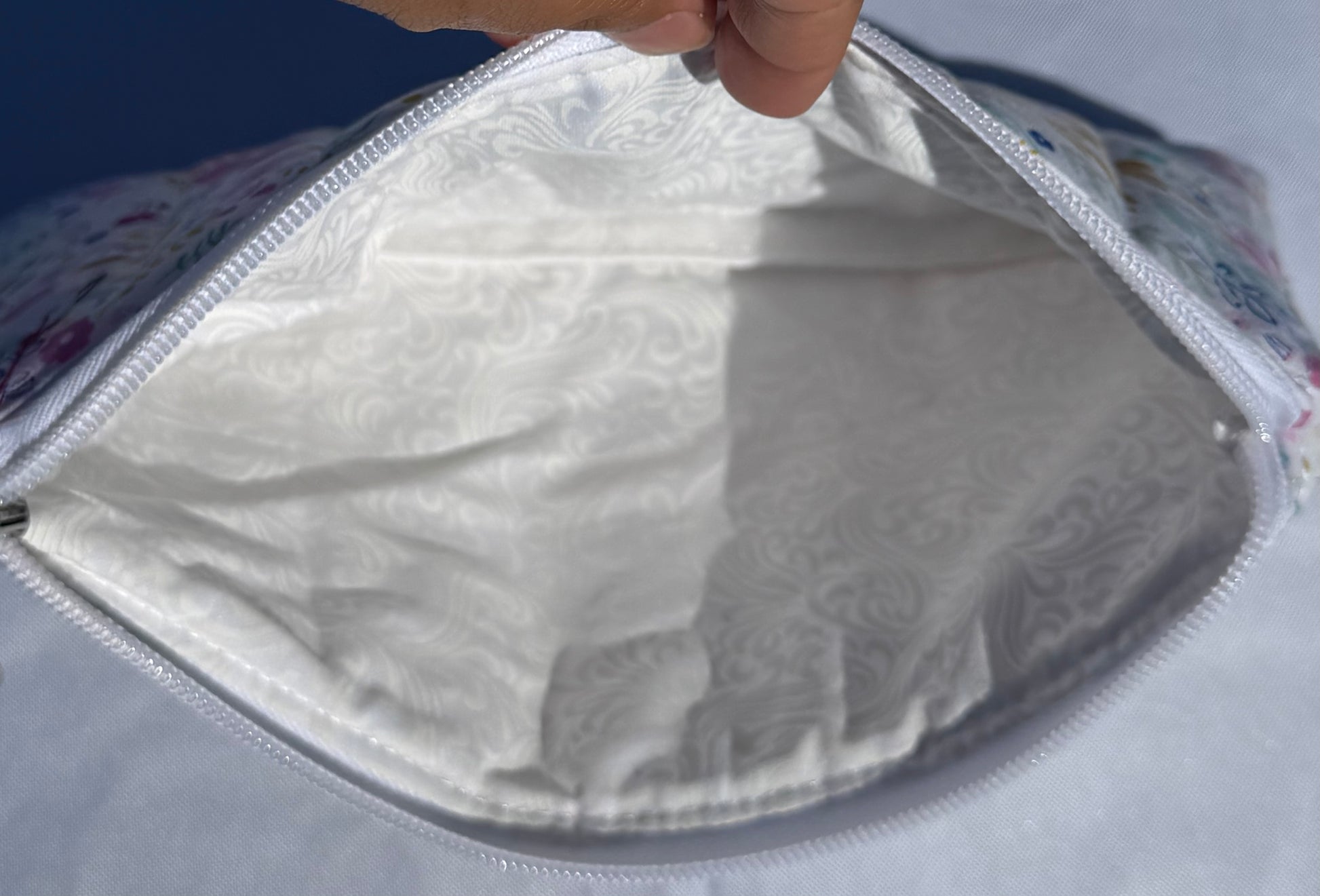 The wallet opens with a smooth white zipper and reveals a fully lined interior featuring an elegant white on white swirl pattern. The inside is spacious, making it ideal for carrying essentials such as cosmetics, travel items, stationery, small tech accessories, or everyday personal items, phone etc.