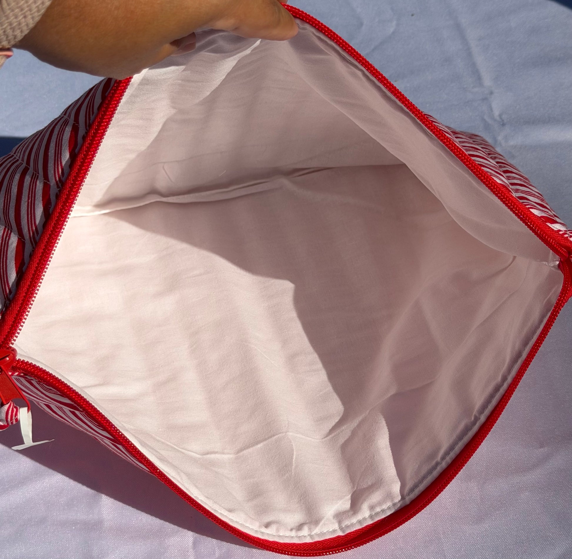 This laptop Sleeve features a festive red-and-white candy cane pattern, quilt-stitched for added texture and durability, The bold diagonal stripes give at a cheerful holiday look. A matching red zipper with a coordinating fabric pull completes the design