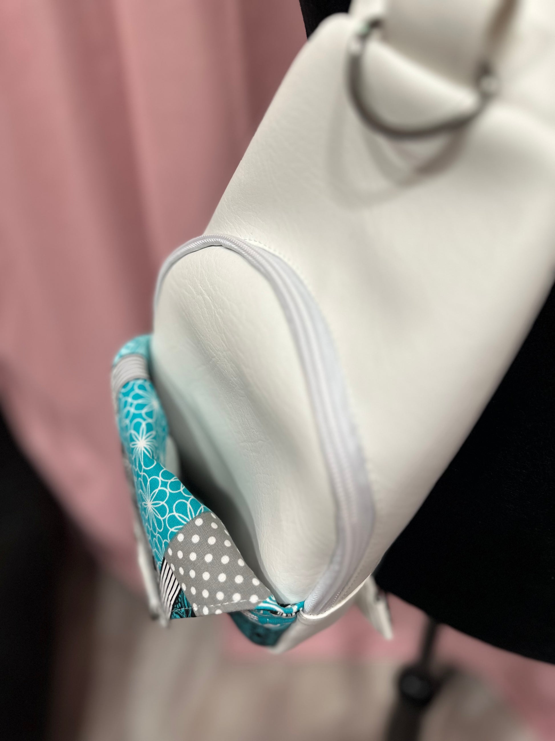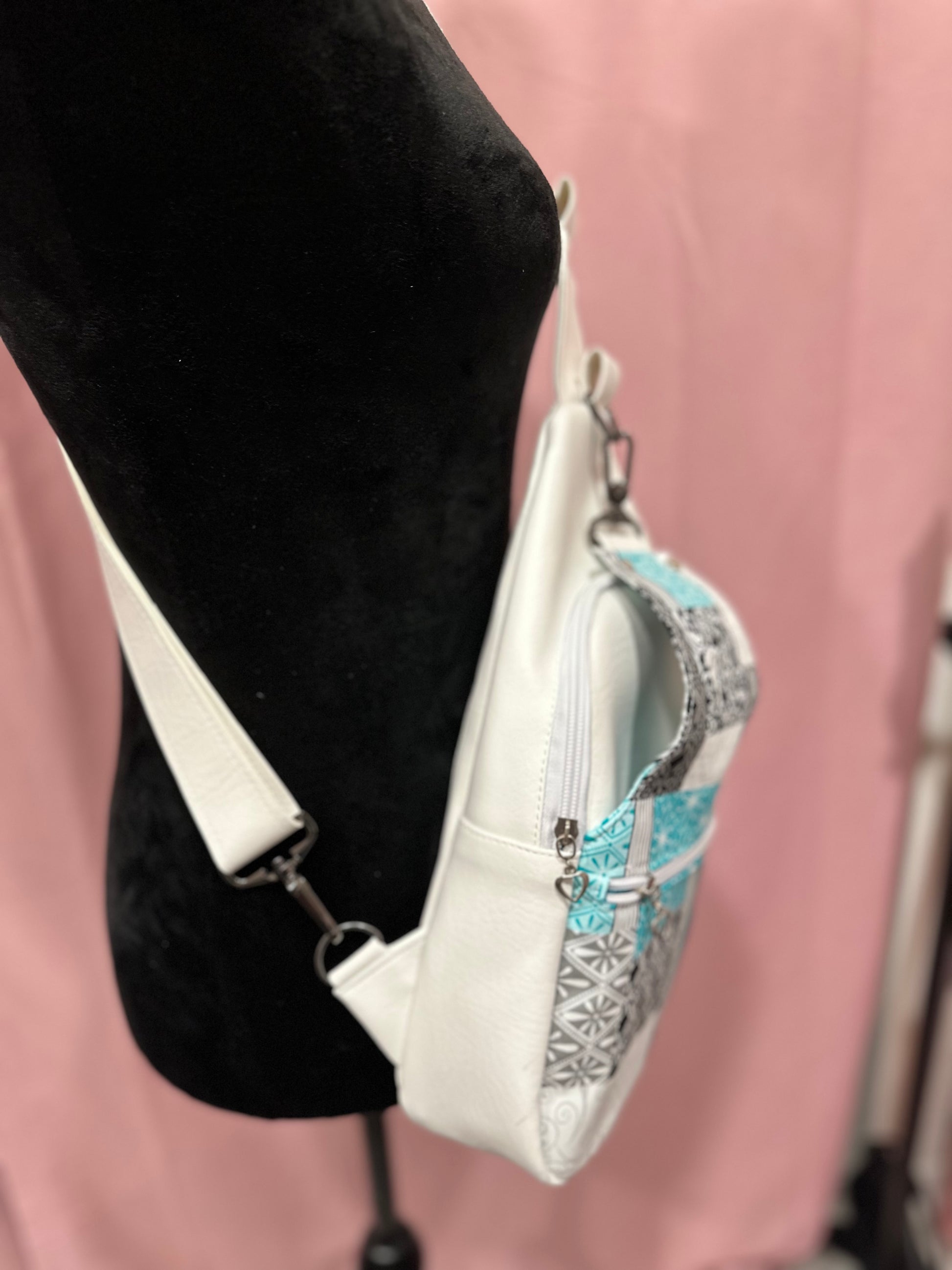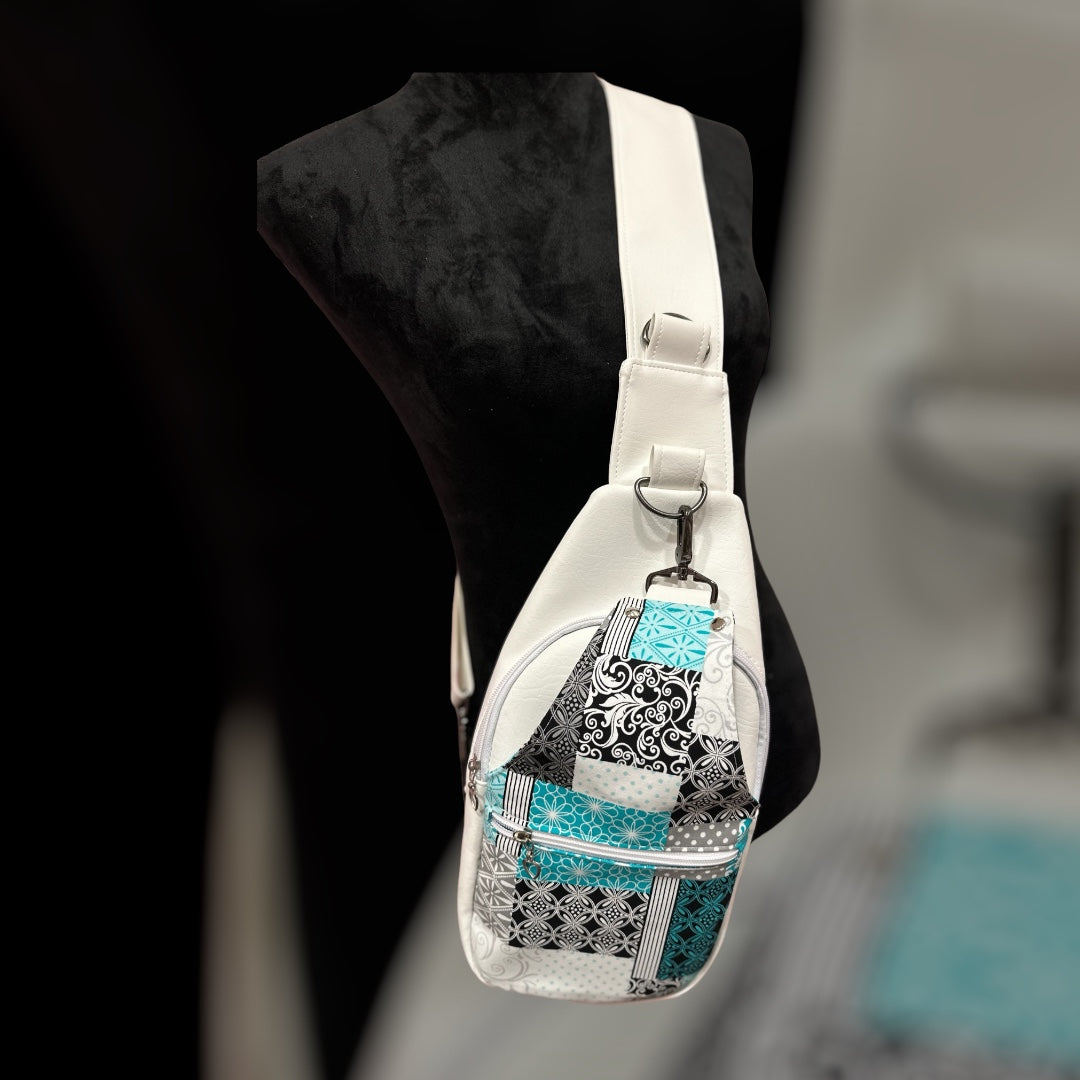 The front of the bag showcases a striking patchwork design consisting of various patterns in black, white, and teal color. The patterns include intricate swirls, geometric shapes, and floral motifs, arranged in a visually appealing manner.