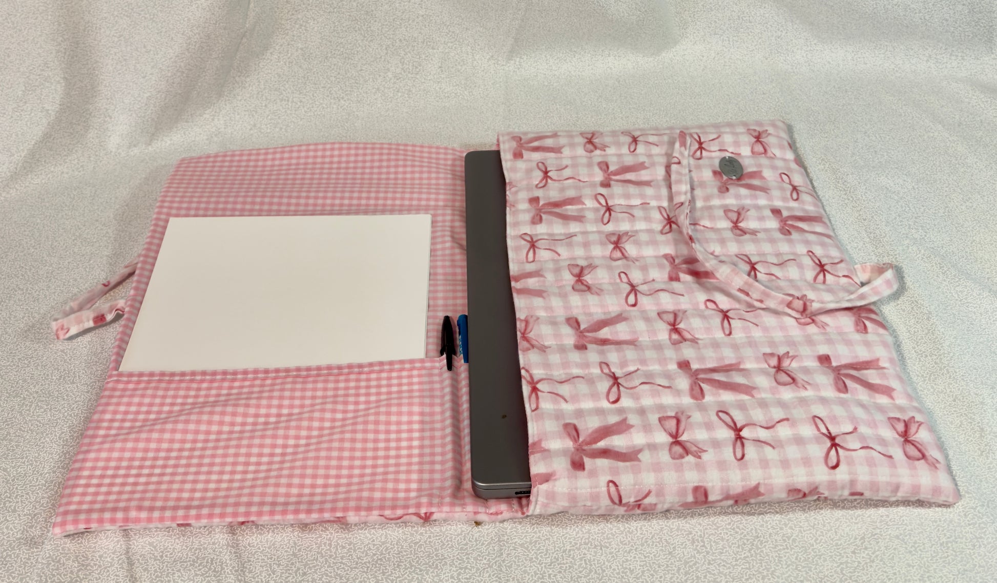 These hand made Covers are ideal for Extra Large books and electronics such as Mac Book pro 16in and windows computer as big as 17in , and almost any tablet and Any ipad, it features a pocket for notepad or any other item you want to take, ties made from the same material and quilted all around with a nice soft yet strong material for added protection.