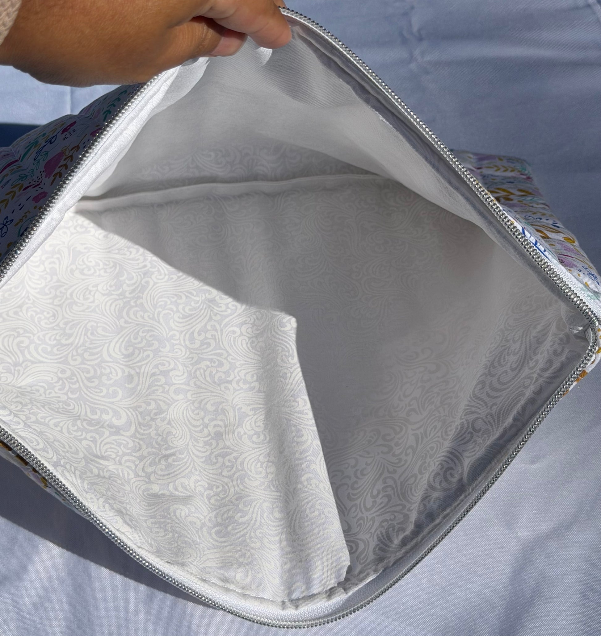 Fully lined with a smooth white fabric accented by an elegant subtle swirl pattern. The padding provides gentle protection for laptops, tablets, notebooks, or documents. A sturdy white zipper keeps items secure, and a matching fabric zipper pull adds a stylish hand-crafted touch.