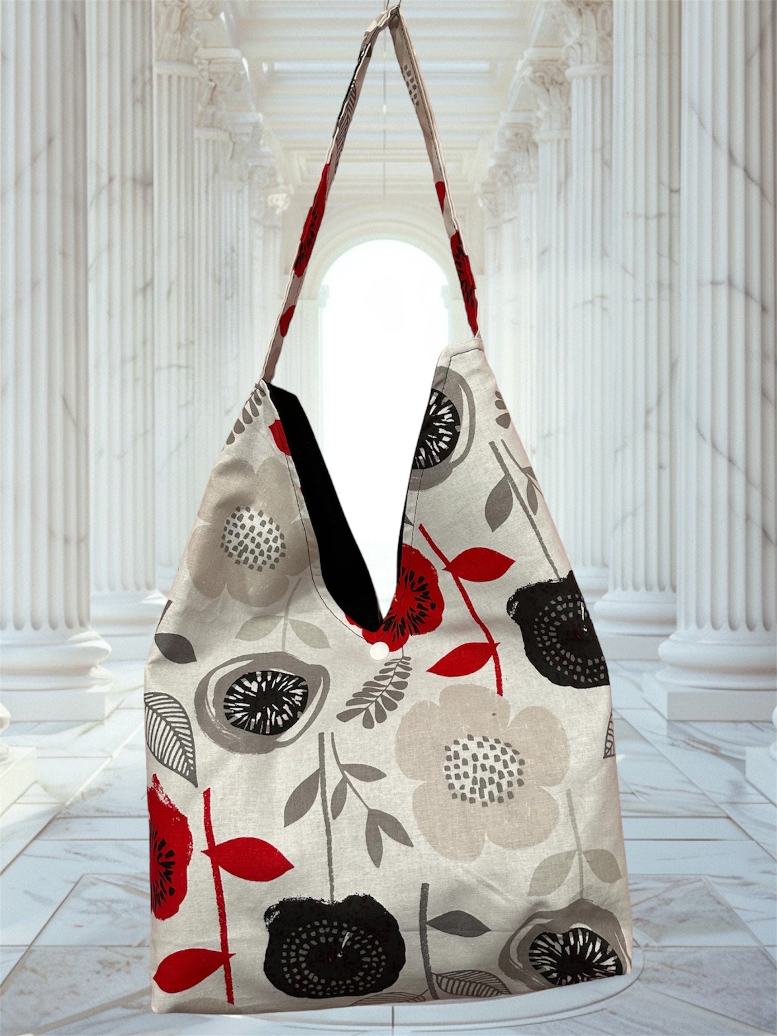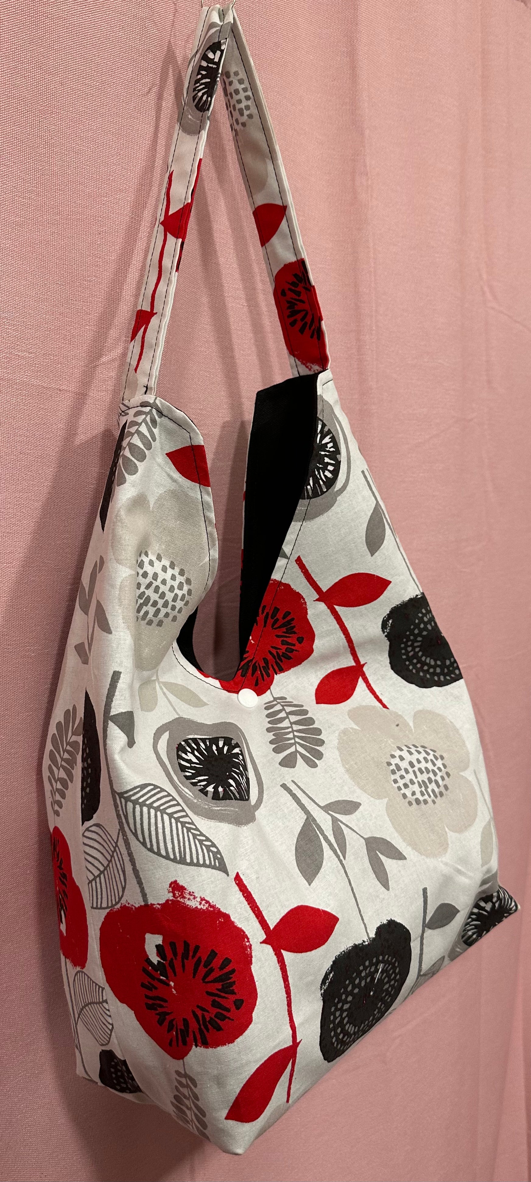 The fabric is printed with a bold floral pattern, featuring large flowers and leaves. The color palette includes the shade of red, black, grey, and white. The flowers are prominently red and black, while the leaves are grey, adding a modern and striking contrast.