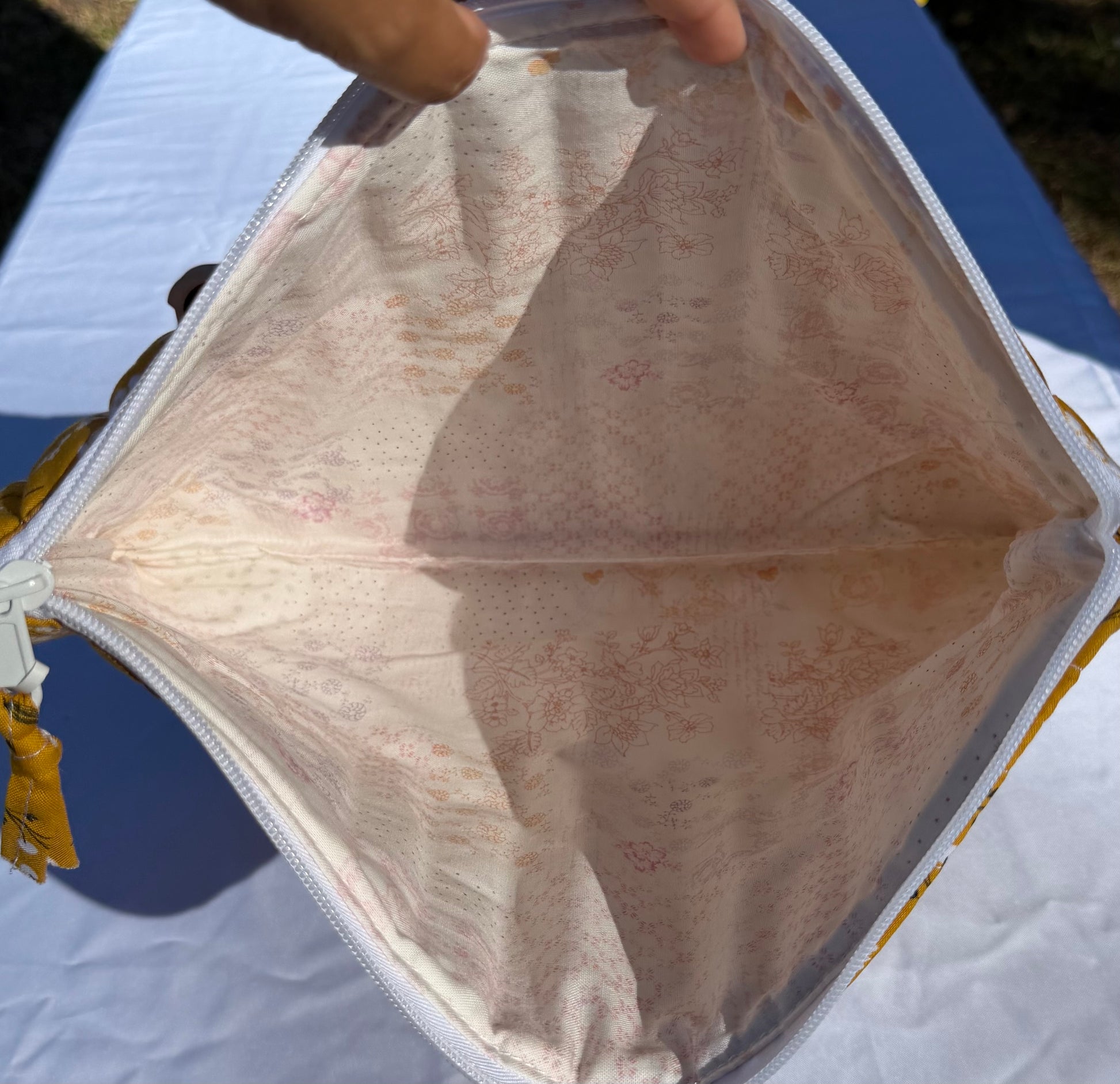 Inside, the sleeve is lined with a soft cream fabric featuring subtle pastel floral outlines and tiny dotted accents, giving it a gentle, handcrafted aesthetic. The interior provides cushioning against bumps and scratches, making it both practical and beautifully crafted.