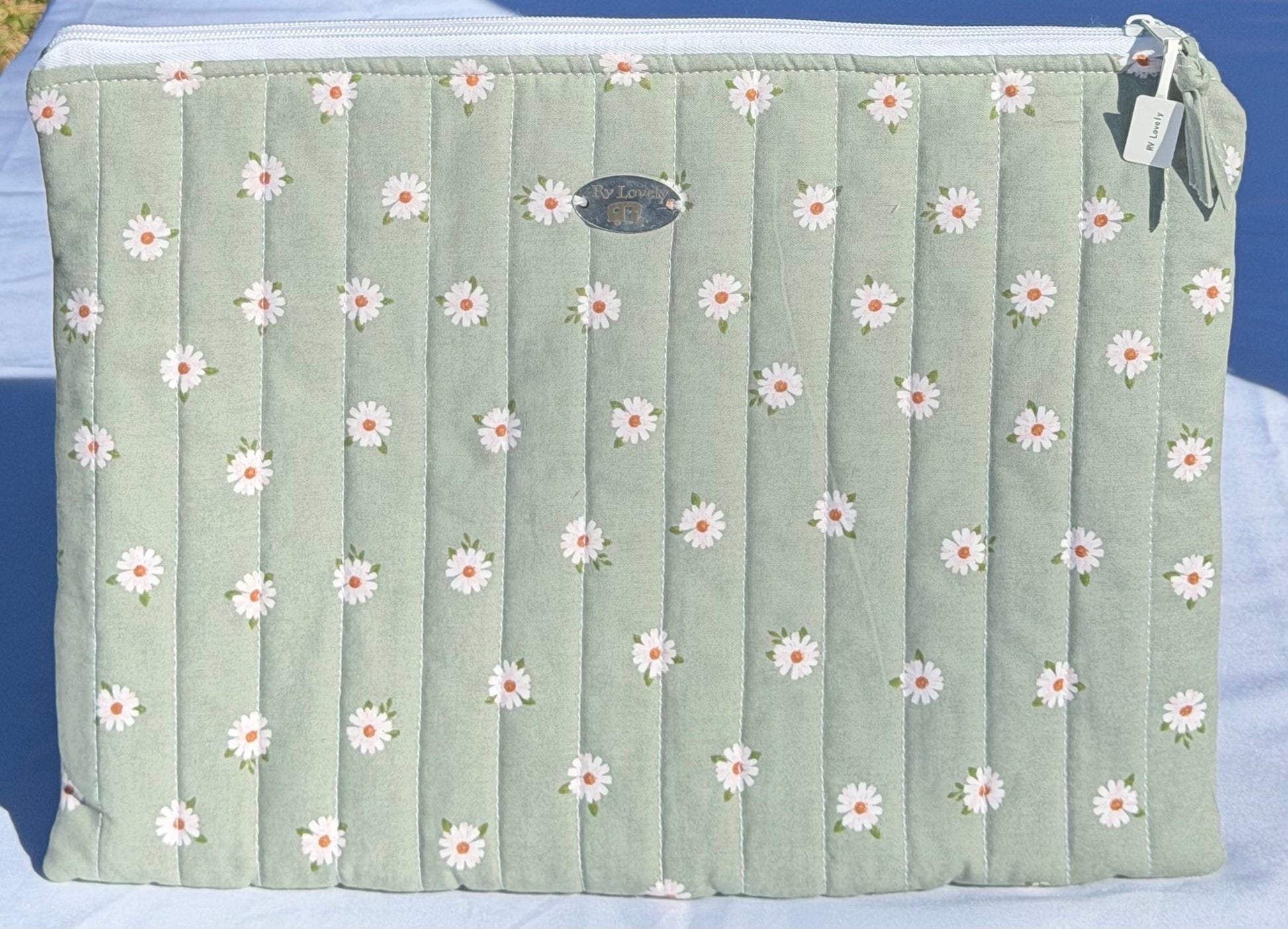 Protect your laptop in style with this beautiful handcrafted quilted sleeve. The exterior features a soft sage-green fabric adorned with a delicate white-daisy pattern, giving it a fresh and cheerful look. Vertical quilting adds structure and durability while maintaining a sleek, modern profile. A sturdy white zipper with a matching fabric pull tab keeps your device secure.