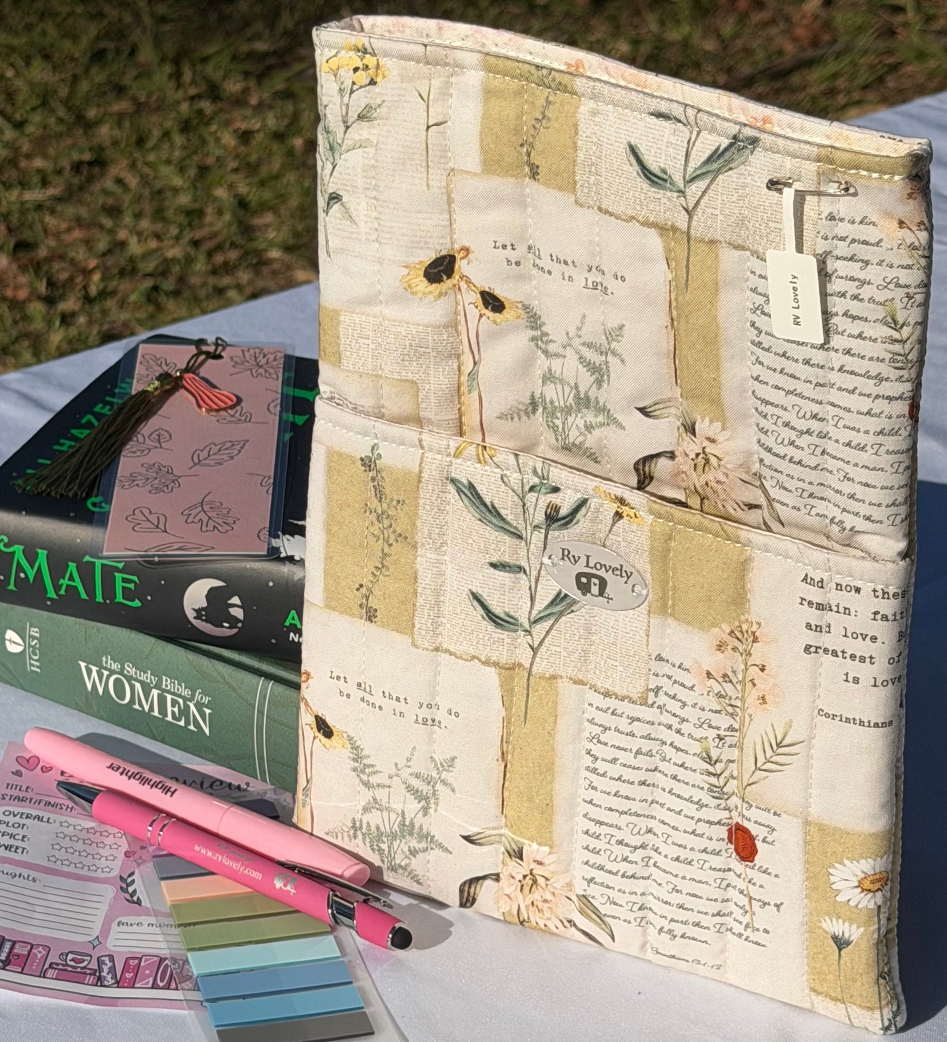 Designed with a soft patchwork of vintage-inspired florals, handwritten script, and warm earthy tones, this sleeve blends charm with everyday functionality. Christian quotes thru out.