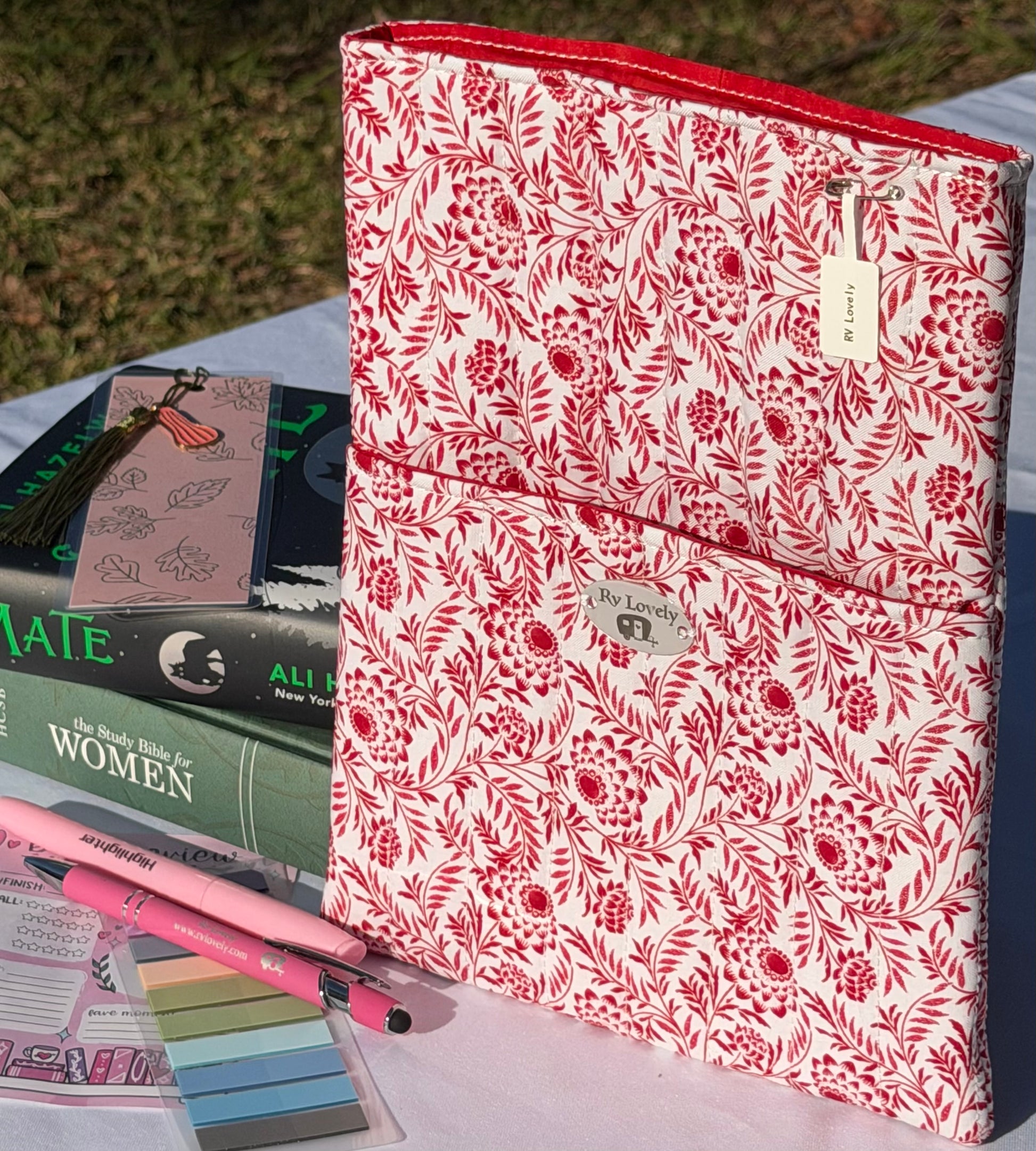 Featuring an eye-catching red floral pattern on a crisp white background, it brings a cheerful pop of color to any bag, desk, or reading corner.