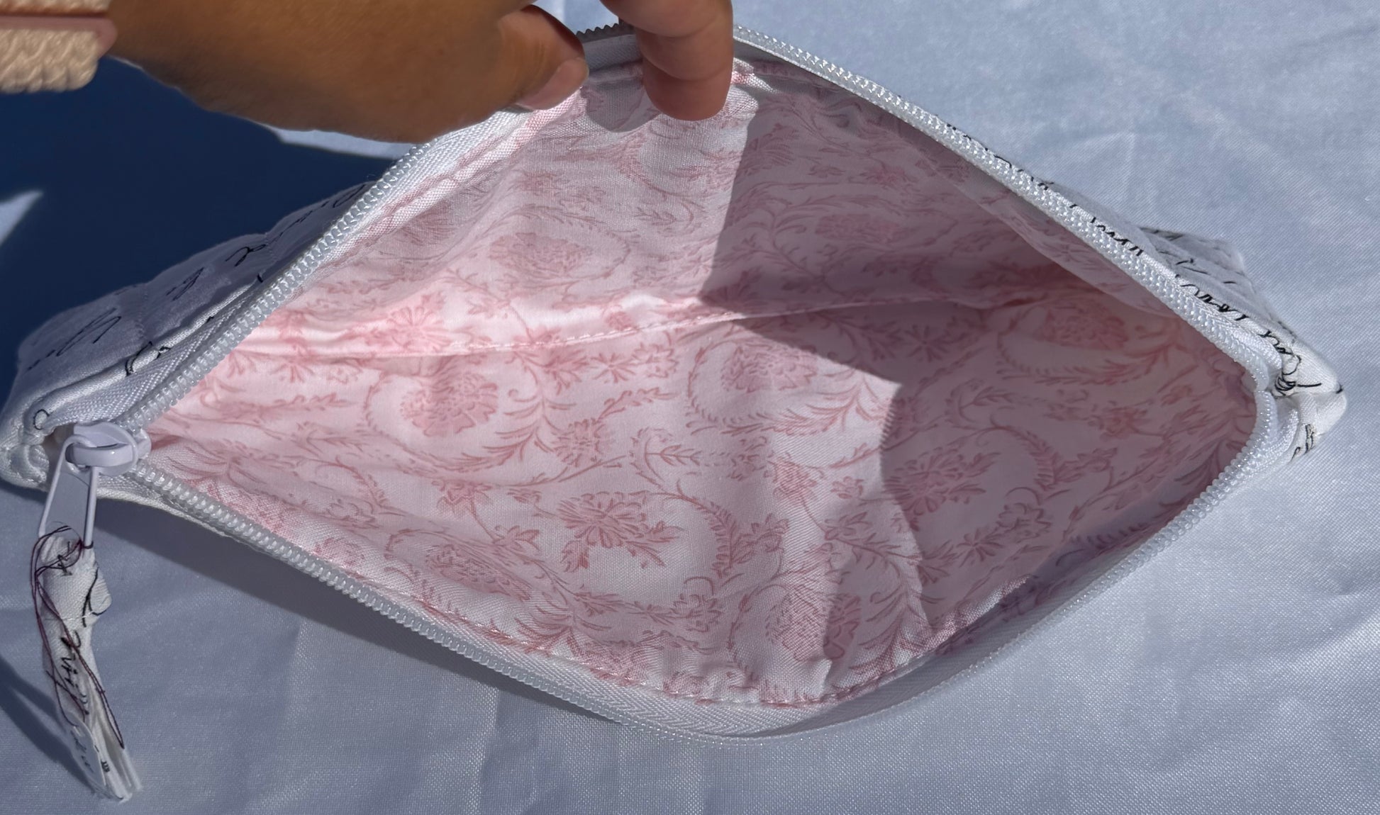 Fully lined with a soft pink floral patterned fabric that adds a delicate feminine touch. The spacious interior is perfect for organizing cosmetics, pens, pencils, crafting supplies and more.