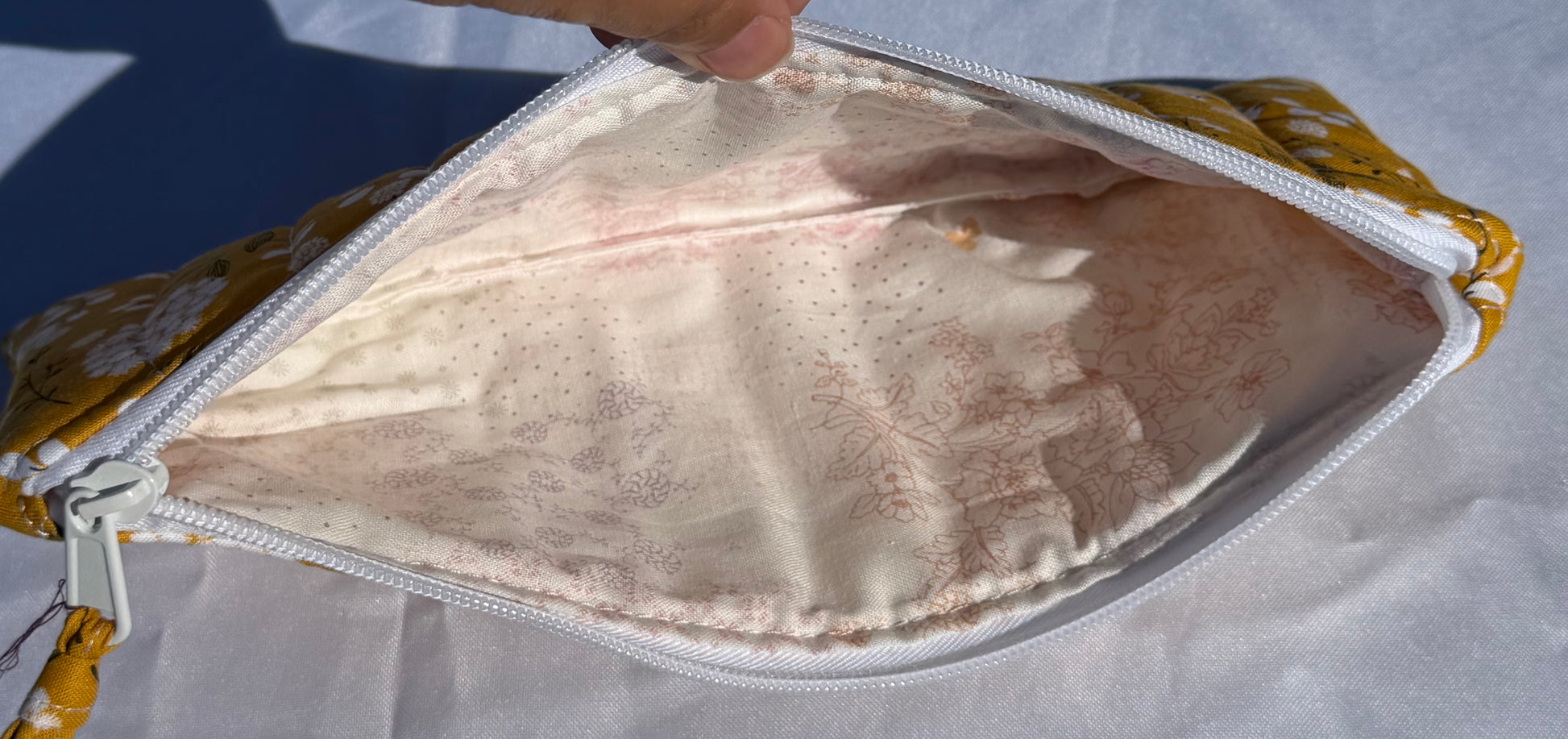 Add a touch of charm to your everyday essentials with this beautiful handmade quilted zipper pouch. The exterior features a warm mustard-yellow background adorned with delicate white and soft green botanical florals, Vertical quilted stitching adds-stitch detailing gives the pouch structure and a high-quality finish. A white zipper with a matching fabric pull tab adds convenience and style.