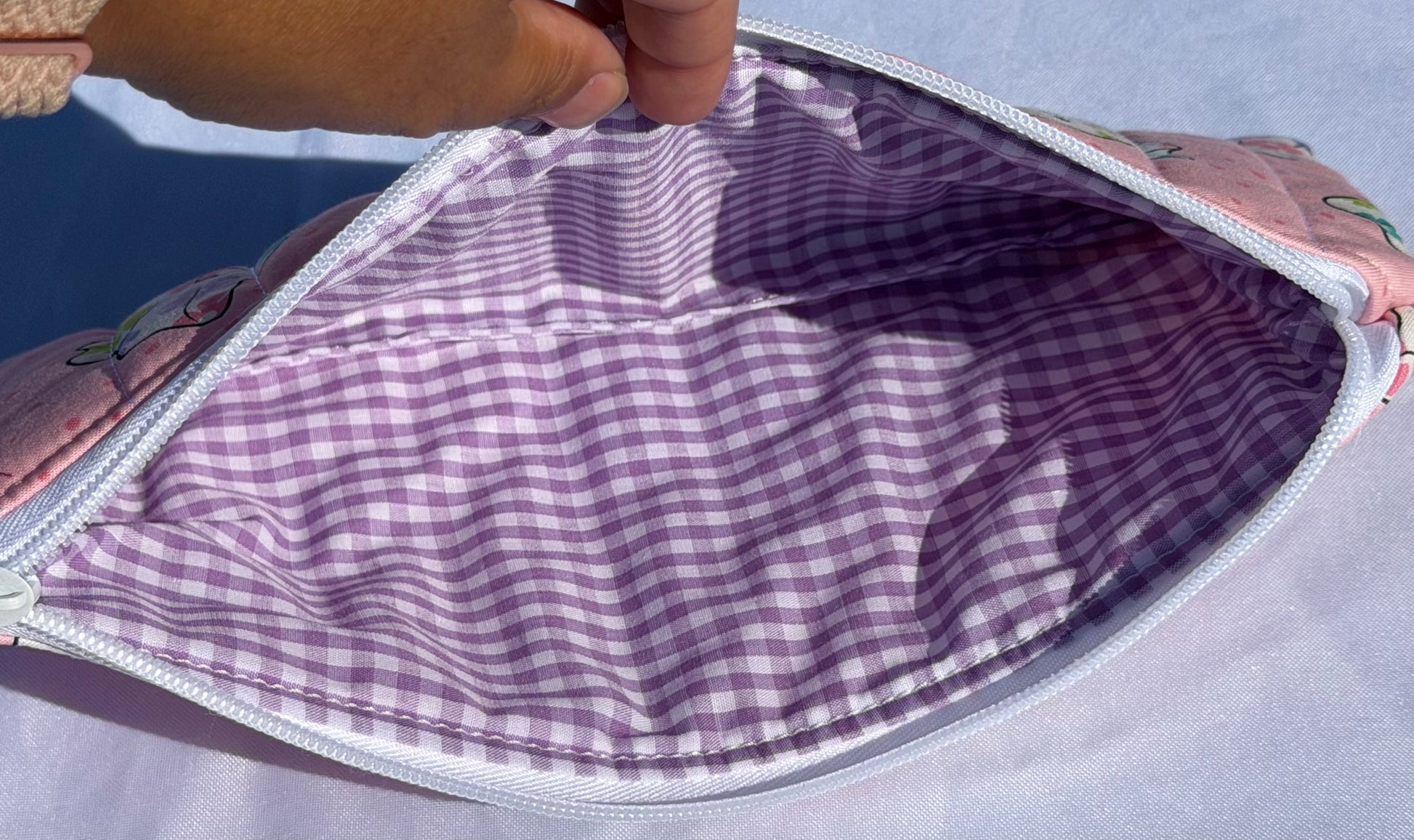 Interior is fully lined with a coordinating lavender-purple gingham fabric, adding a cheerful and stylish pop of color. The lining is smooth and soft, making it easy to wipe clean and ideal for keeping your belongings organized.