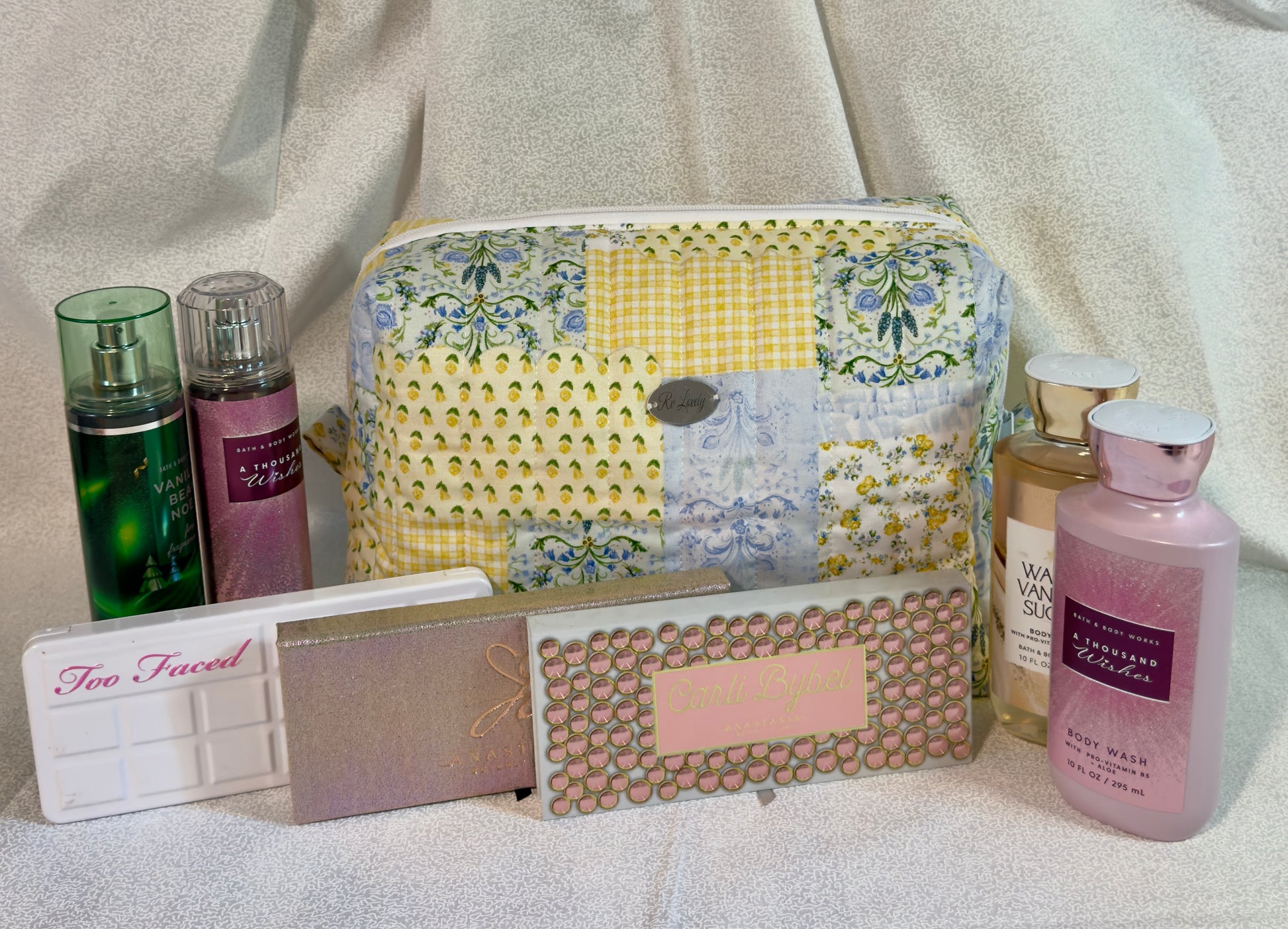 Our large handmade quilted makeup bag up bag is made of cotton material, the colors are beautiful bright yellows, greens, blues and florals. This bag has tabs on each side for easy opening and closing, zipper pull is made of same material as the bag.