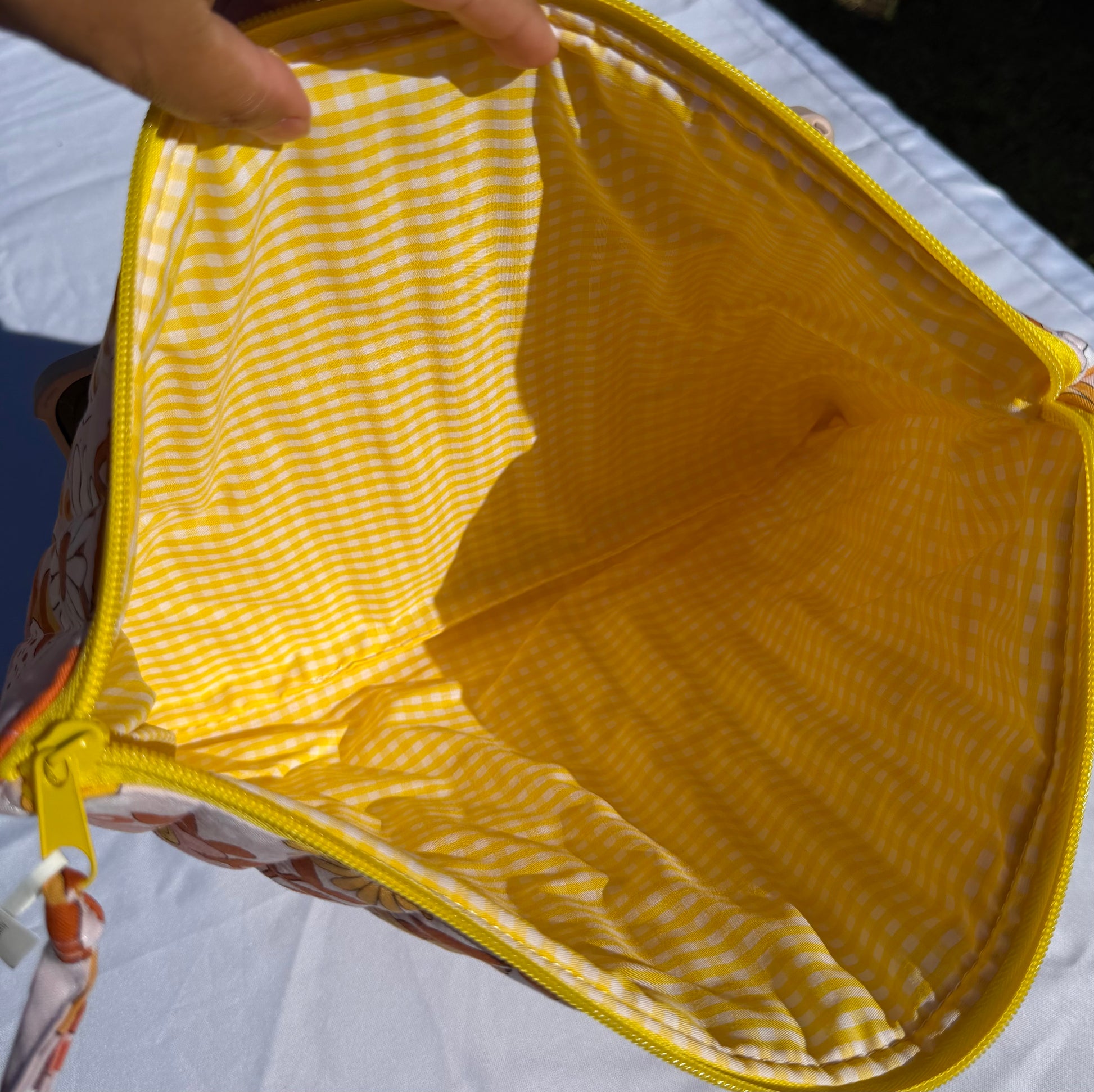 The sleeve opens with a smooth yellow zipper ands coordinating fabric pull tab for easy access, Inside the laptop sleeve is fully lined with a bright yellow gingham fabric, creating a bold, sunny contrast to exterior. The cushioned interior helps protect your laptop from everyday bumps and scratches the sleeve lightweight and easy to carry.