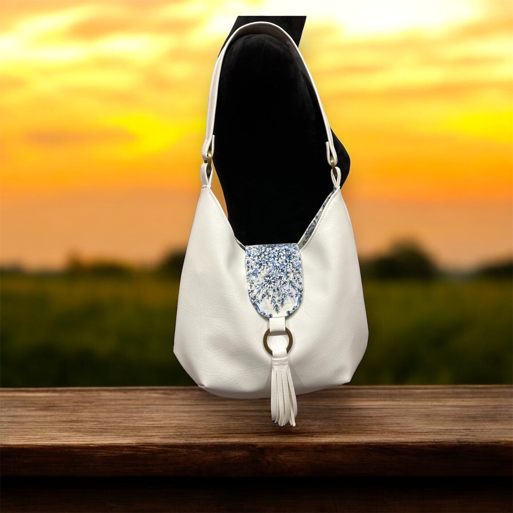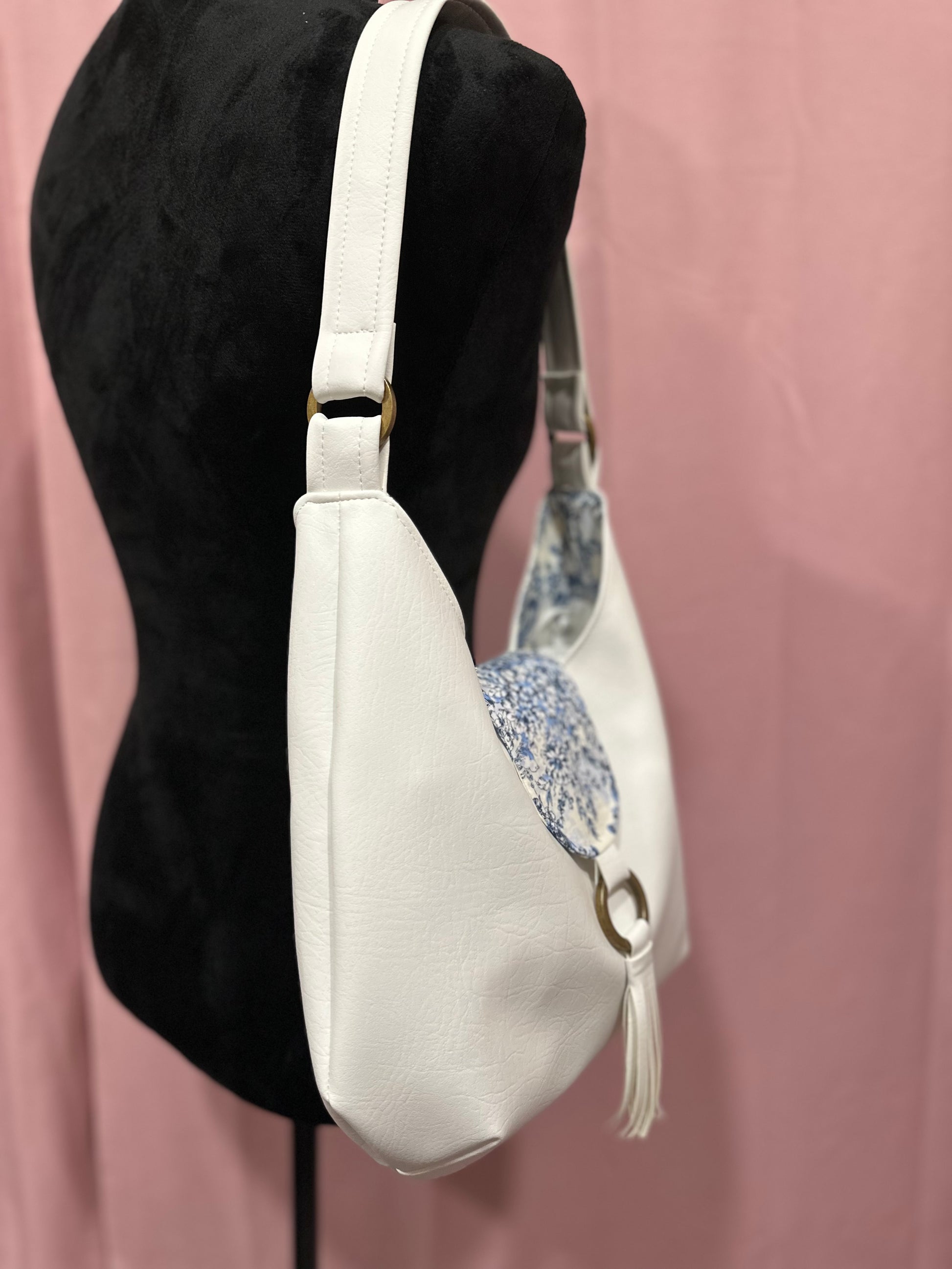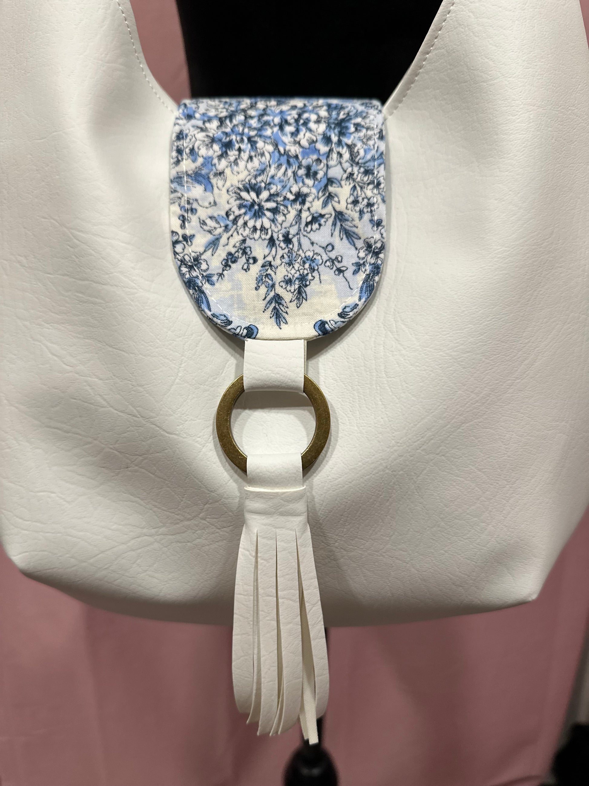 The bag has a flap closure with a blue and white floral pattern on it. Below the flap, there is a metallic ring to which a white soft faux leather tassel is attached, adding a decorative element to the design