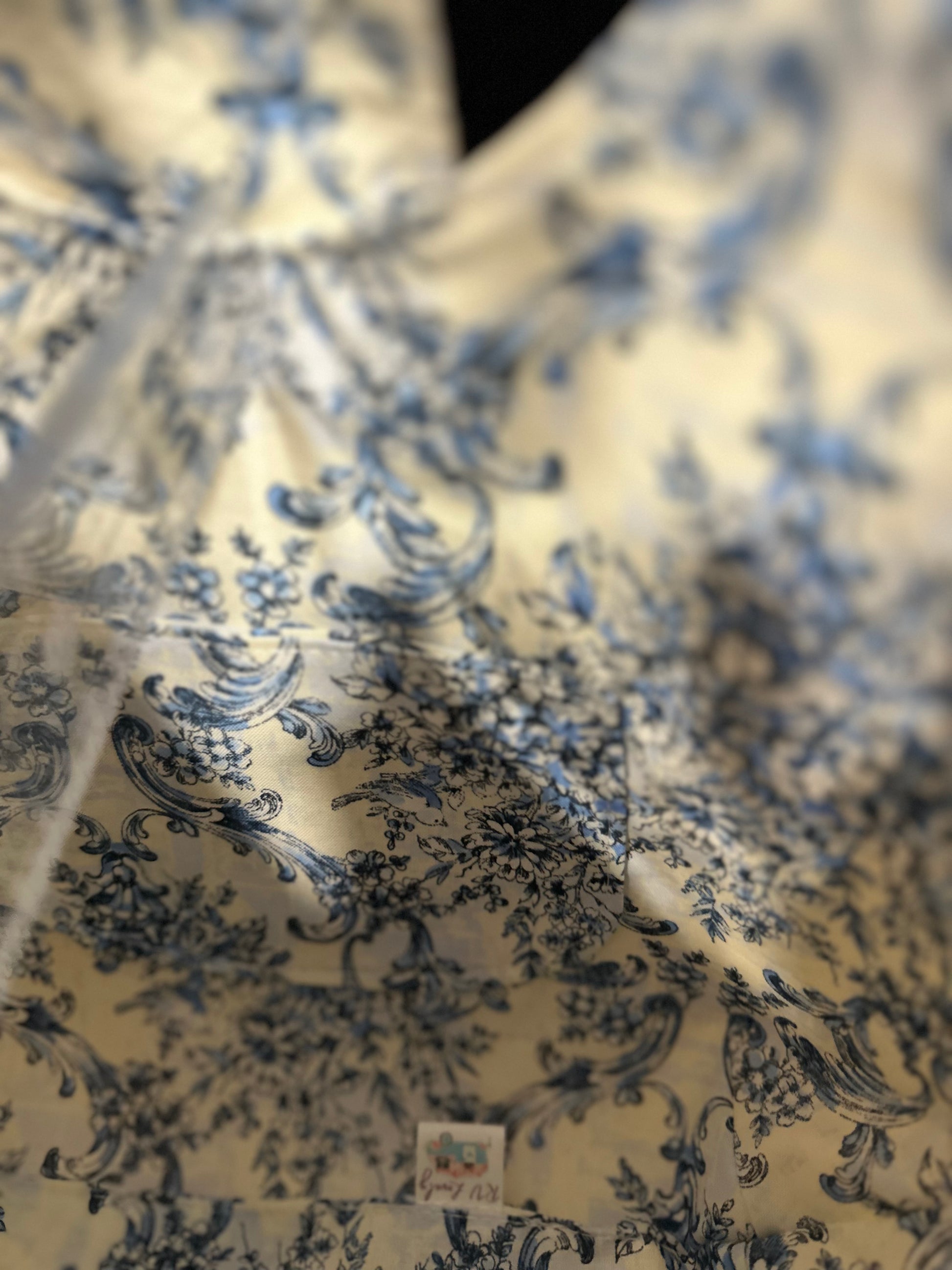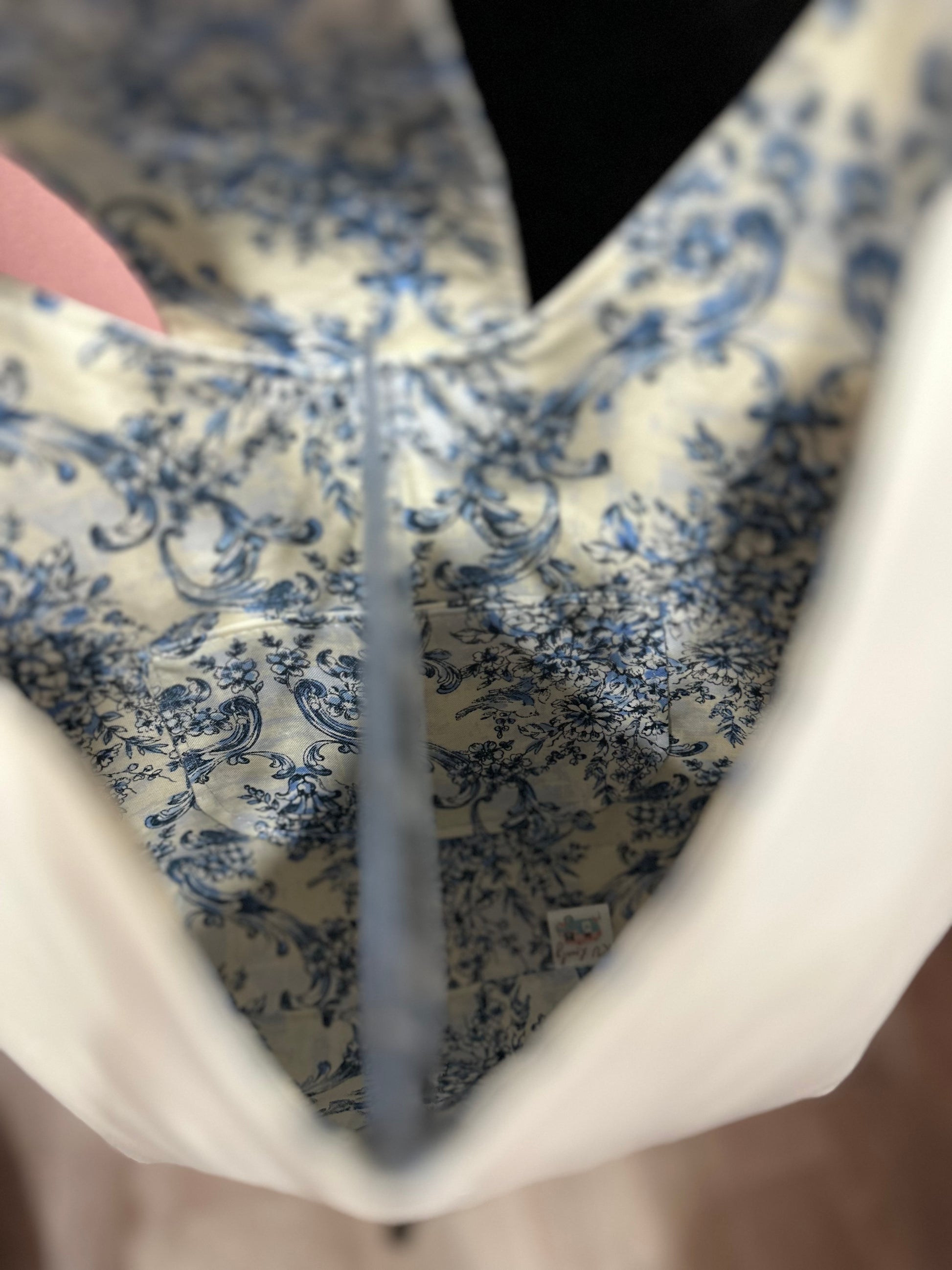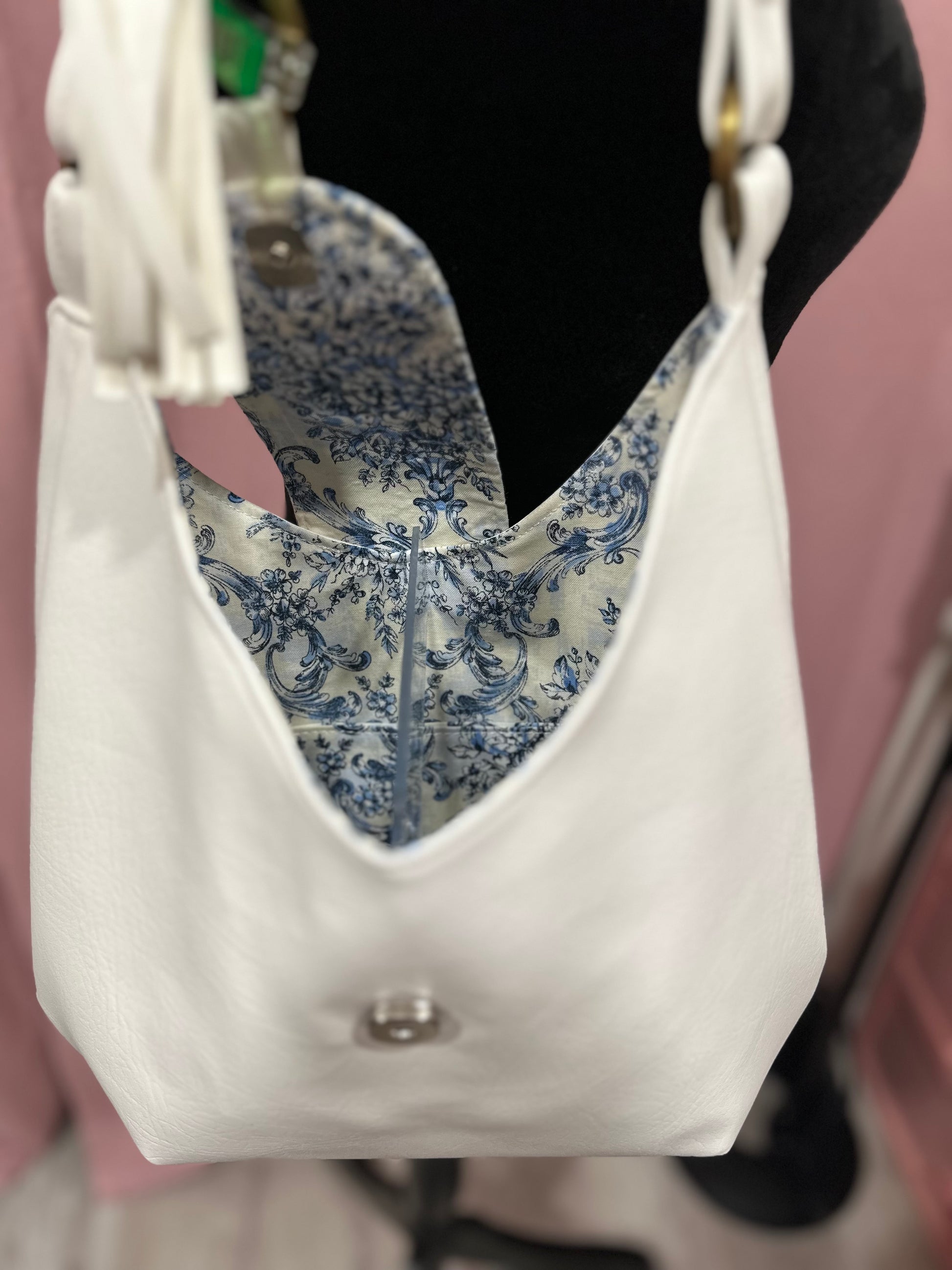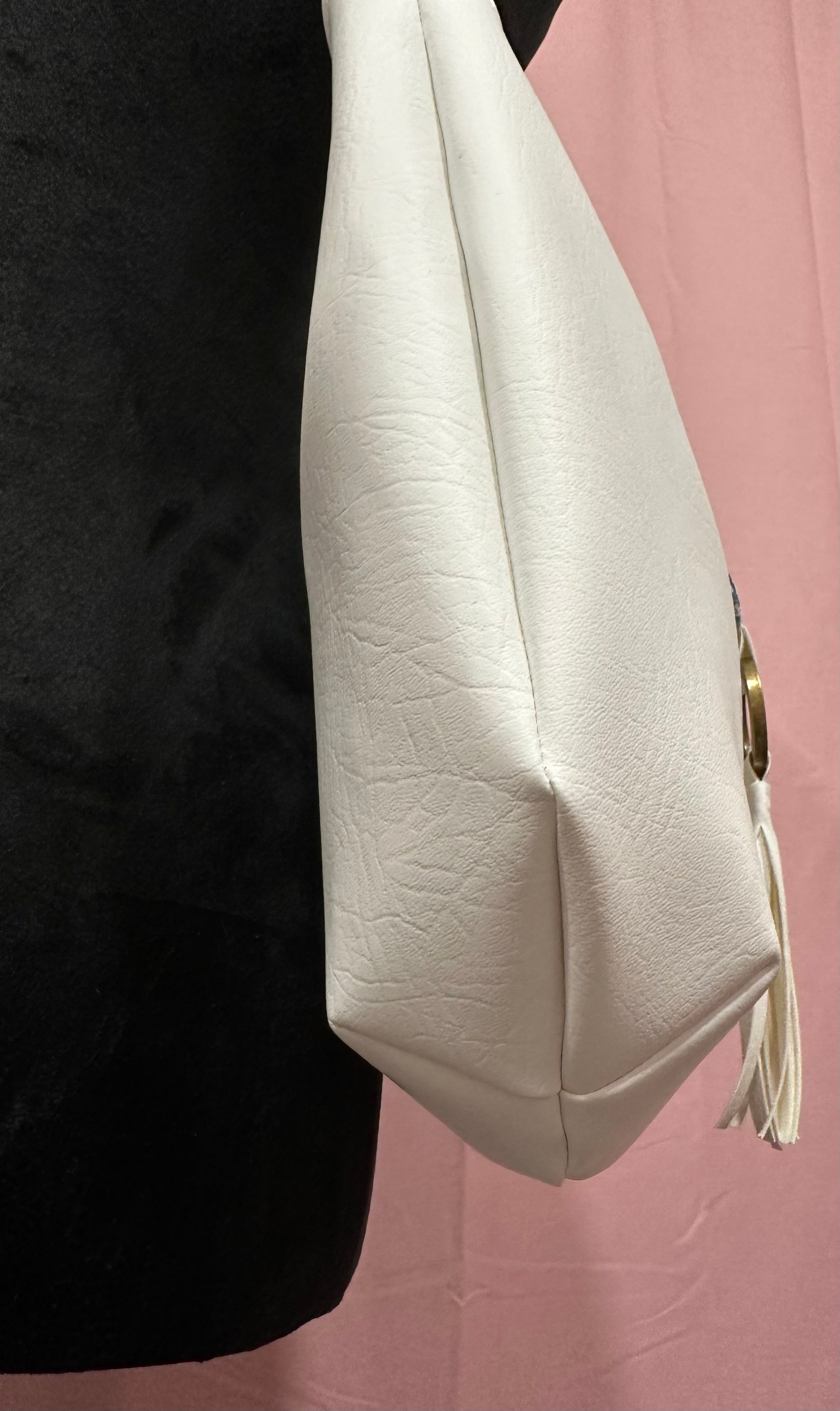 The bag has a flap closure with a blue and white floral pattern on it. Below the flap, there is a metallic ring to which a white soft faux leather tassel is attached, adding a decorative element to the design