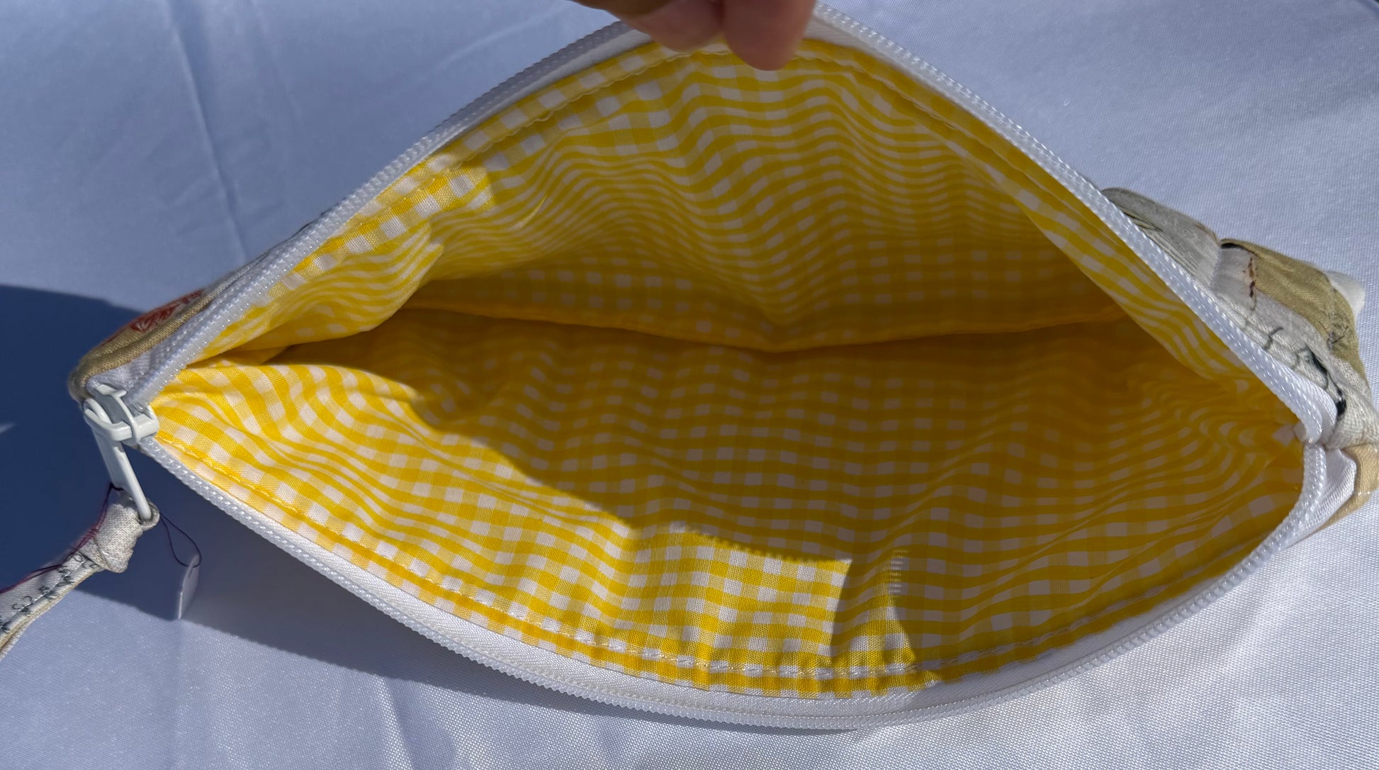 The pouch opens with a smooth white zipper and is fully lined with a cheerful yellow and white gingham cotton fabric, giving the inside a bright, fresh pop of color. It’s lightweight, flexible and perfect for everyday use.