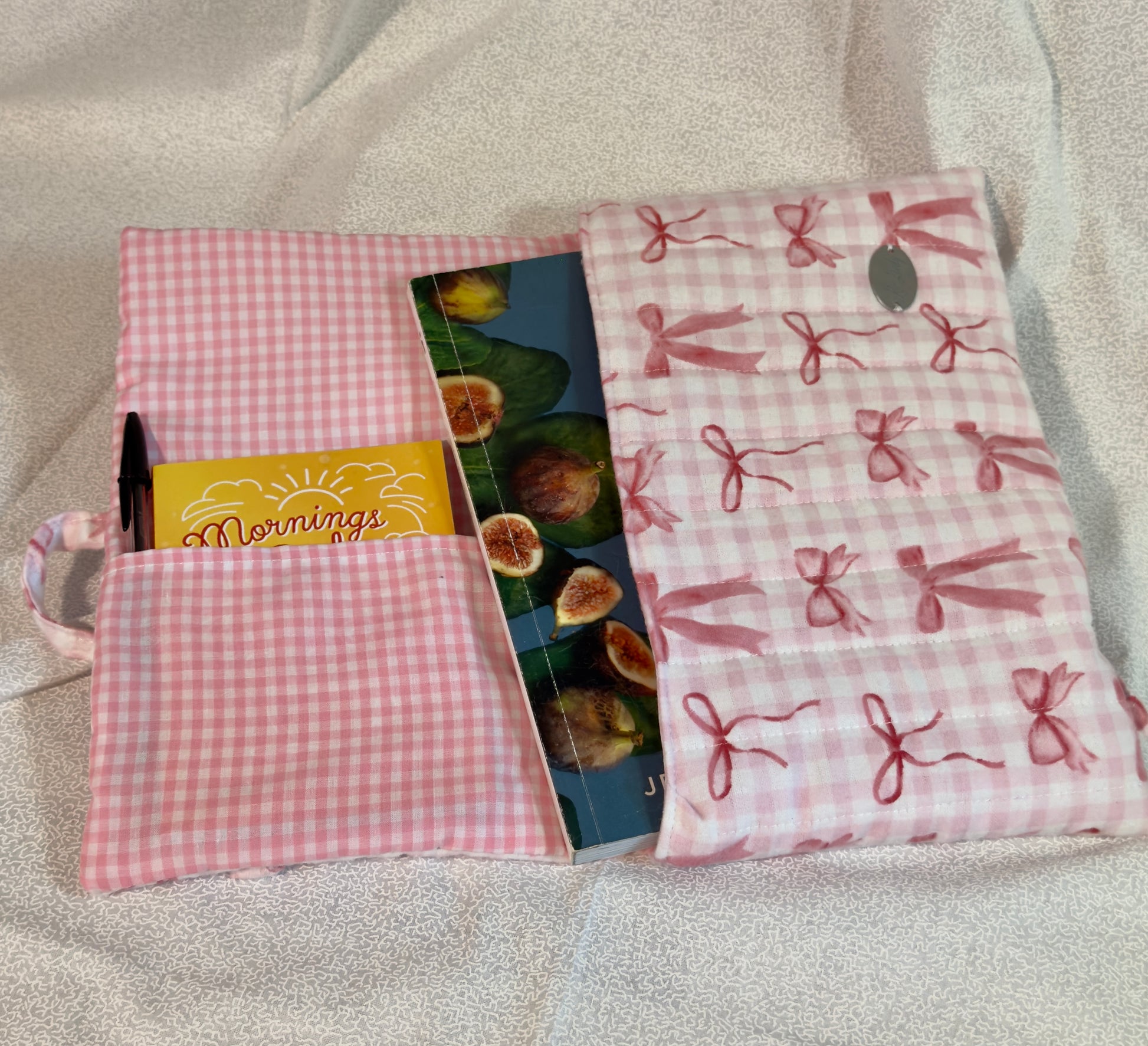 These hand made Covers are ideal for small books and electronics such as Kindle, it features a pocket for notepad or any other item you want to take, ties made from the same material and quilted all around with a nice soft yet strong material all the way around for added protection.
